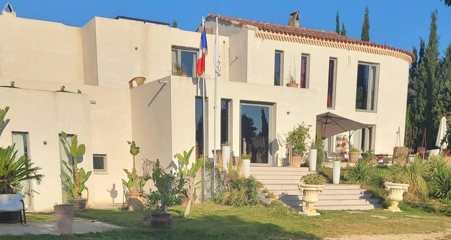 Maison d’hôtes à vendre à Arles dans les Bouches du Rhône : Villa année 60, entièrement autonome, rénovée entièrement dans le style Mallet Stevens, de 580 m² sur 3 hectares de parc entourés de champs d’Oliviers, à 5 mn en voiture centre ville Arles.